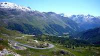 Take time for a break at the lakes. Looking down on the lakes from the restaurant Hospizio Bernina, you’ll see the Lej Nair to the right and the Lago Bianco to the left. Coming up to the Hospice, you followed the waters coming from the Lej Nair. The waters from this lake will flow into the Inn, the Danube, and end up in the Black Sea. Going down the south side of the pass you’ll be following the waters from the Lago Bianco. This water will join the Po River and end up in the Mediterranean. You are standing on a European water divide.